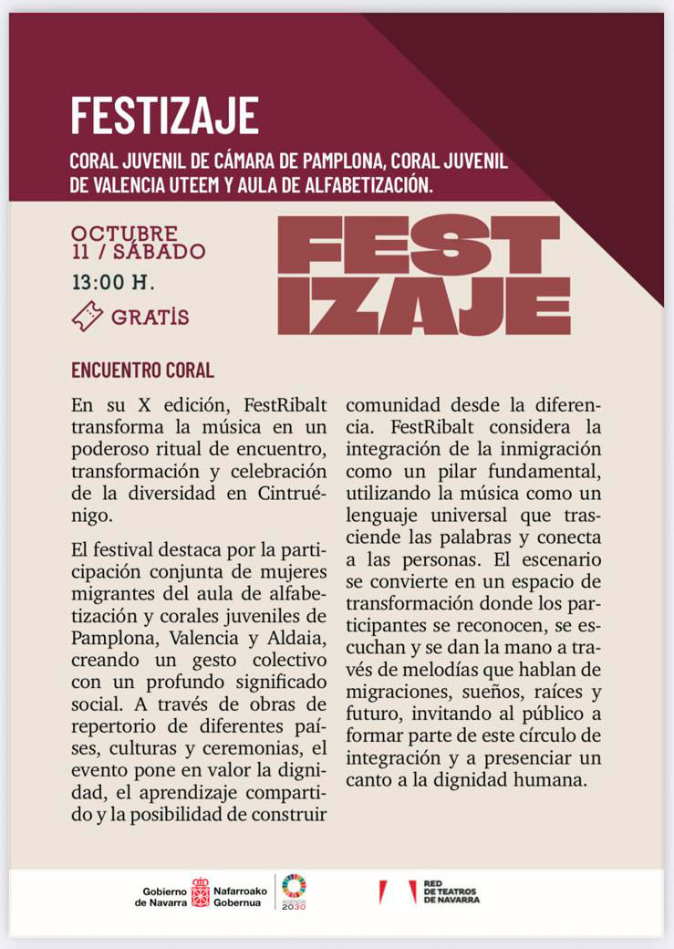 Coral juvenil de cámara de Pamplona, Coral juvenil de Valencia Eteem y Aula de Alfabetización. Entrada gratuita, previa reserva de entradas pulsando en '+ Info.