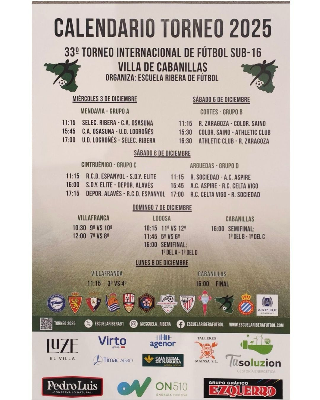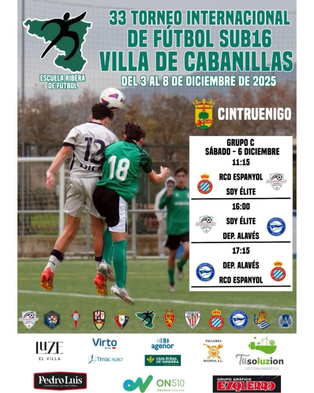 Con motivo del 33º Torneo Internacional de Fútbol Sub 16 Villa de Cabanillas, nuestro campo de fútbol acogerá este sábado 6 de diciembre varios partidos entre algunas de las mejores promesas del panorama internacional.