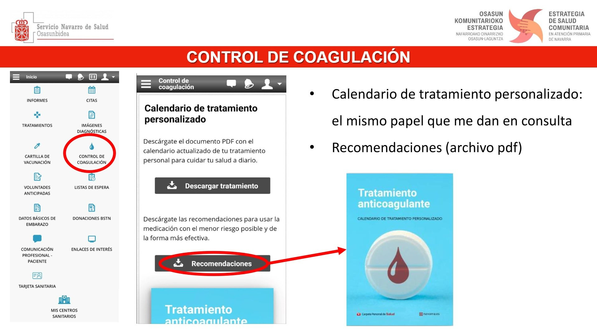 Servicio de salud para el control personalizado de tratamientos anticoagulantes, incluyendo calendario de tratamiento y recomendaciones en imagen adjunta.