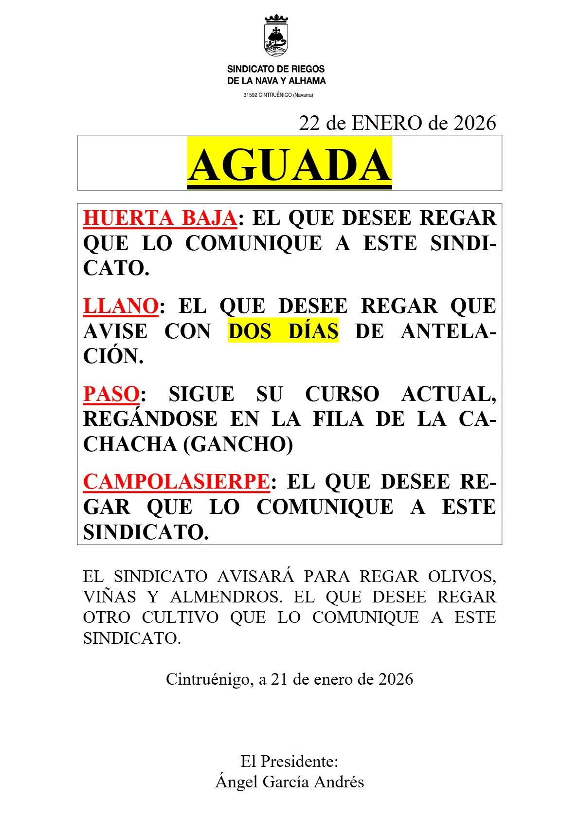 Las inscripciones se harán en el Sindicato de Riegos (c/ Primicia n°37) a Casto Alvero ind...