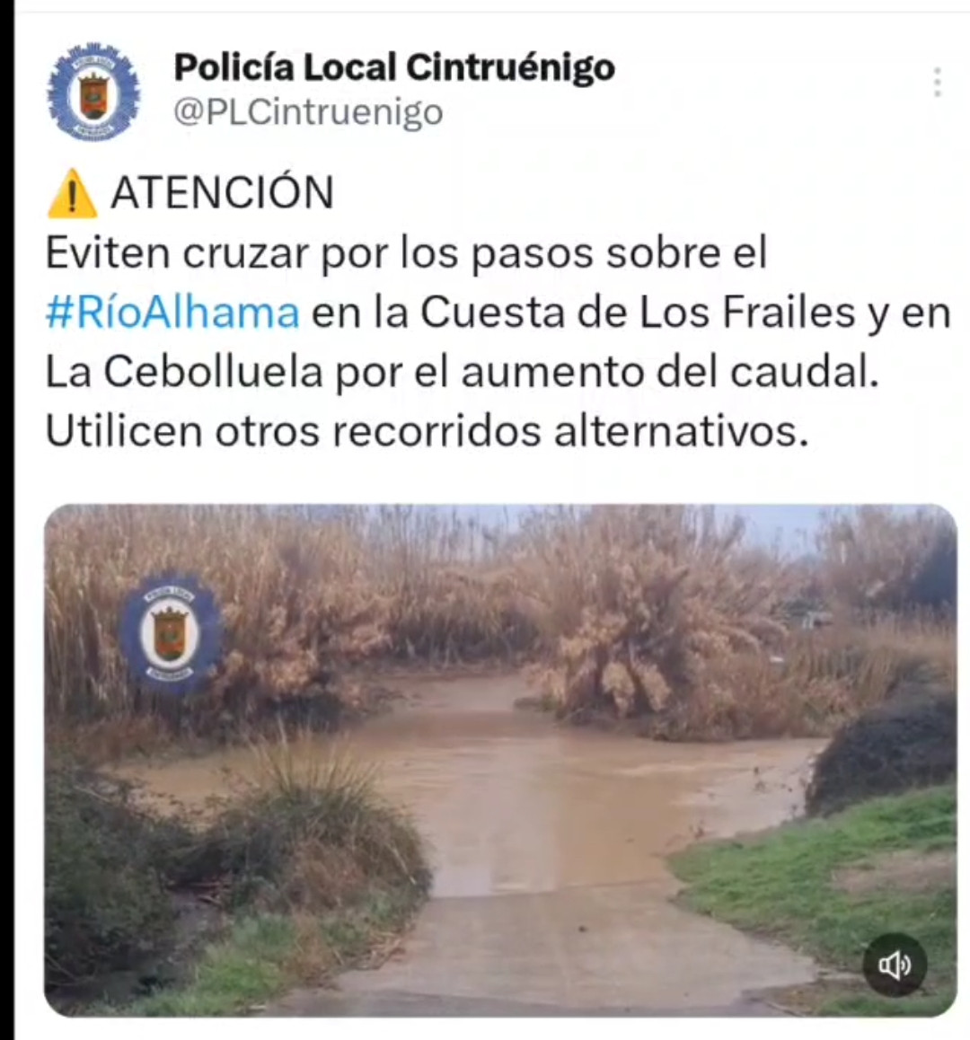 Eviten cruzar por los pasos sobre el Río Alhama en la Cuesta de Los Frailes y en La Cebolluela por el aumento del caudal.