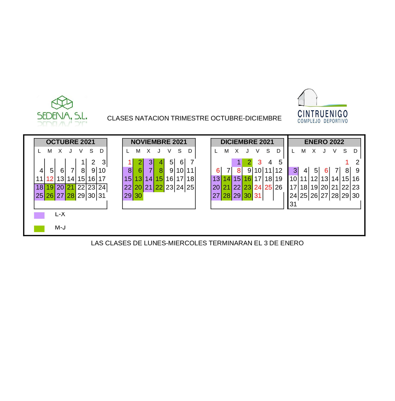 El comienzo de los Cursos de Natación será el próximo lunes 18 de octubre. Adjuntamos calendario de los días en que se impartirán las clases...