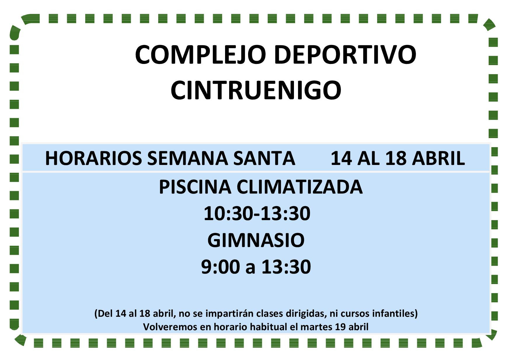 Horarios de la Piscina climatizada y el gimnasio. Del 14 al 18 de abril. Más información en documento adjunto.