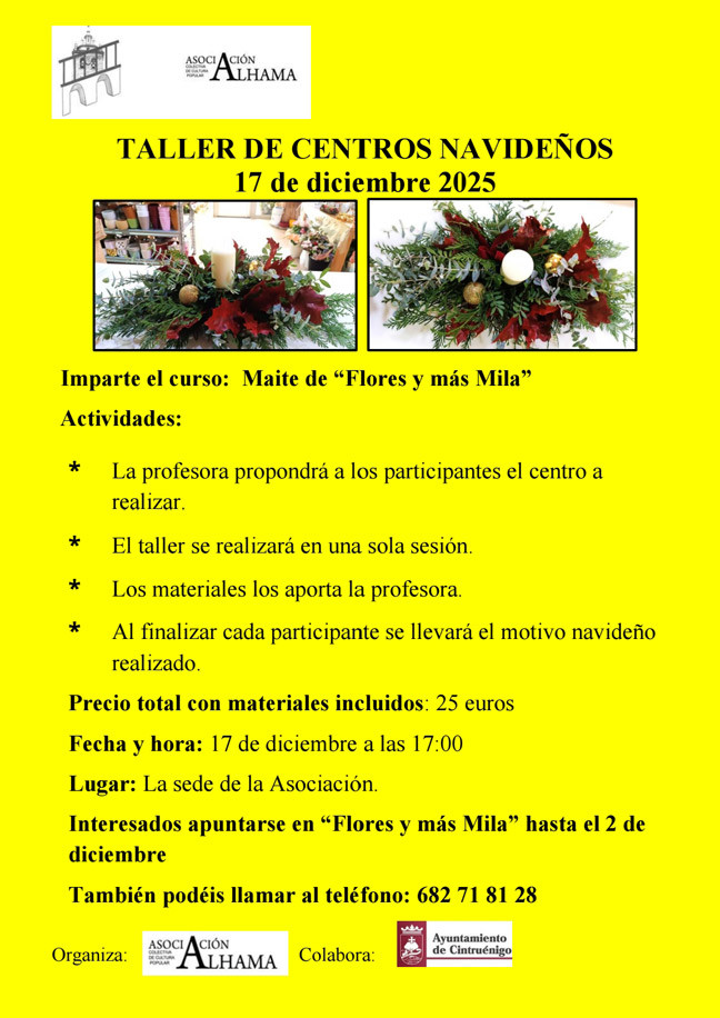 Miércoles 17 de diciembre Horario: 17:00 horas Lugar: sede Asociación de Mujeres Alhama Inscripciones en: "Flores y más Mila" hasta el martes 2 de diciembre. Tel. 682 71 81 28 Más información en cartel adjunto.