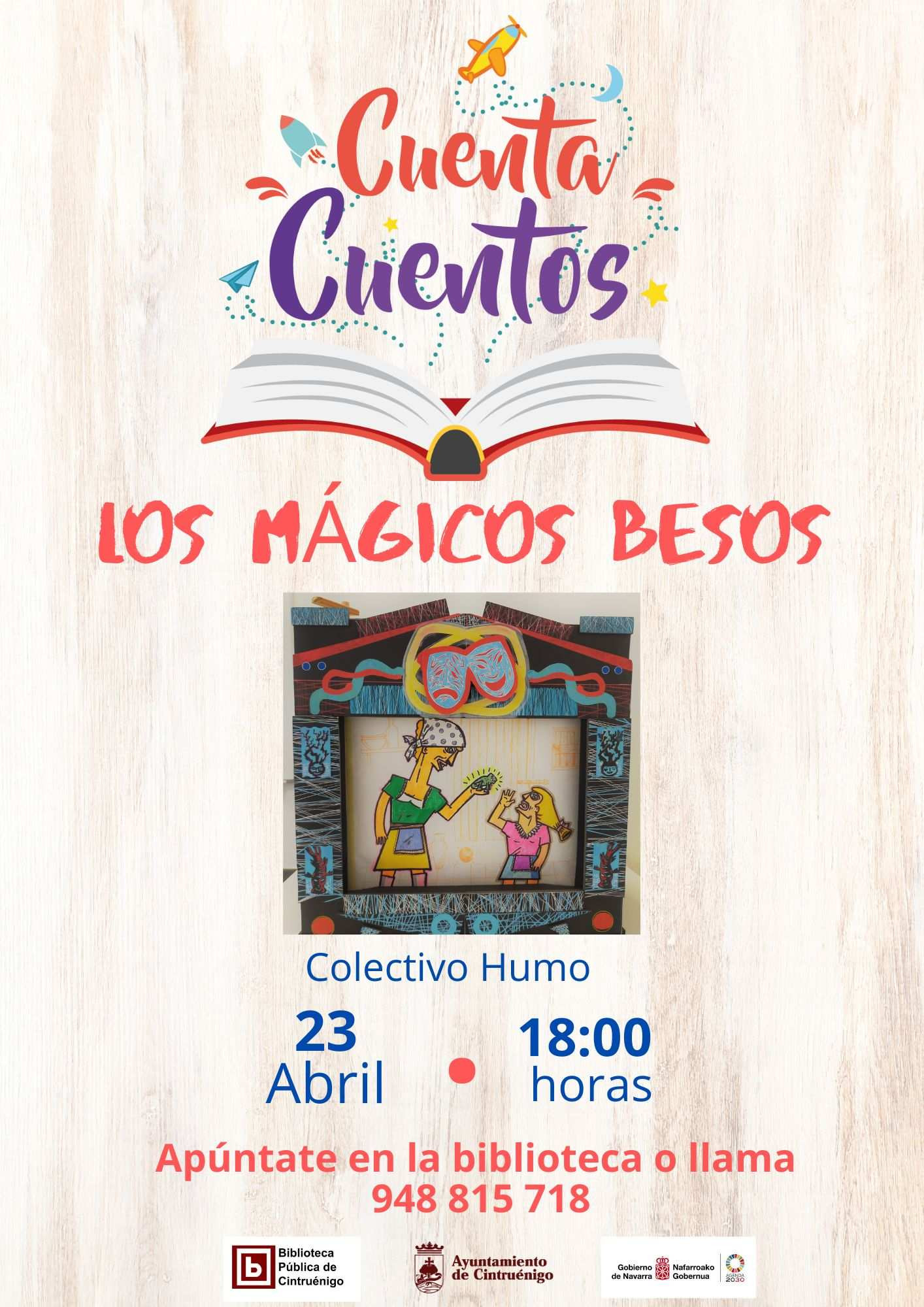Actividad de cuentos para niños titulada 'Los Mágicos Besos' organizada por el Colectivo Humo. Para apuntarse en la biblioteca o llamar al número 948 815 718