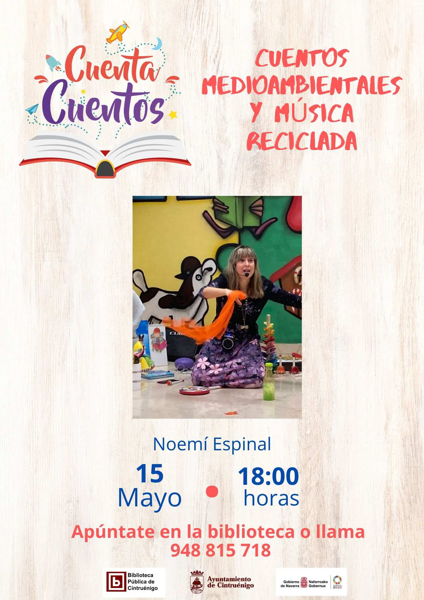 Noemí Espinal presentará cuentos medioambientales acompañados de música reciclada. Para apuntarse en la biblioteca o más información, llamar al 948 815 718