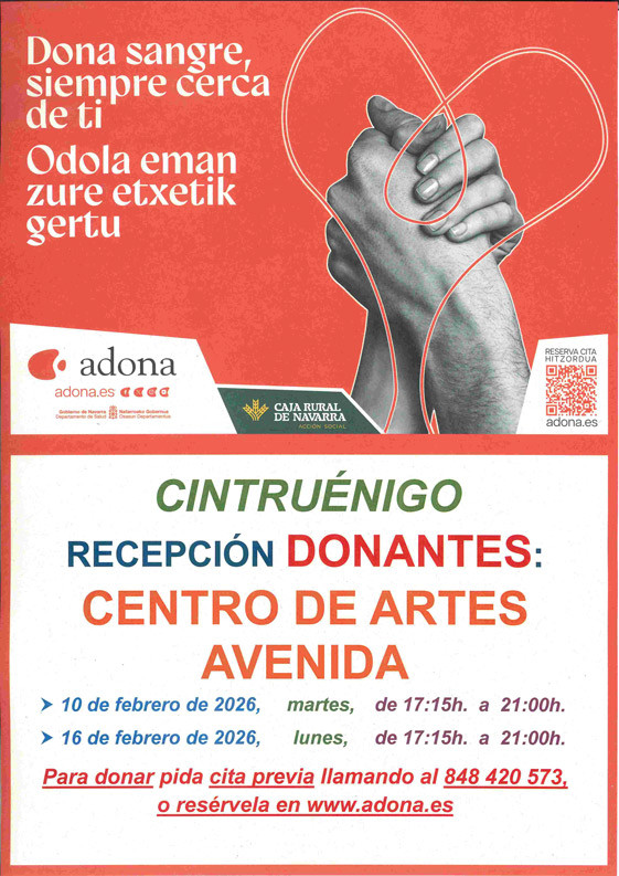 Martes 10 y lunes 16 de febrero Horario: 17:15 a 21:00 horas Para donar pida cita previa: Tel. 848 420 573 https://www.adona.es/es