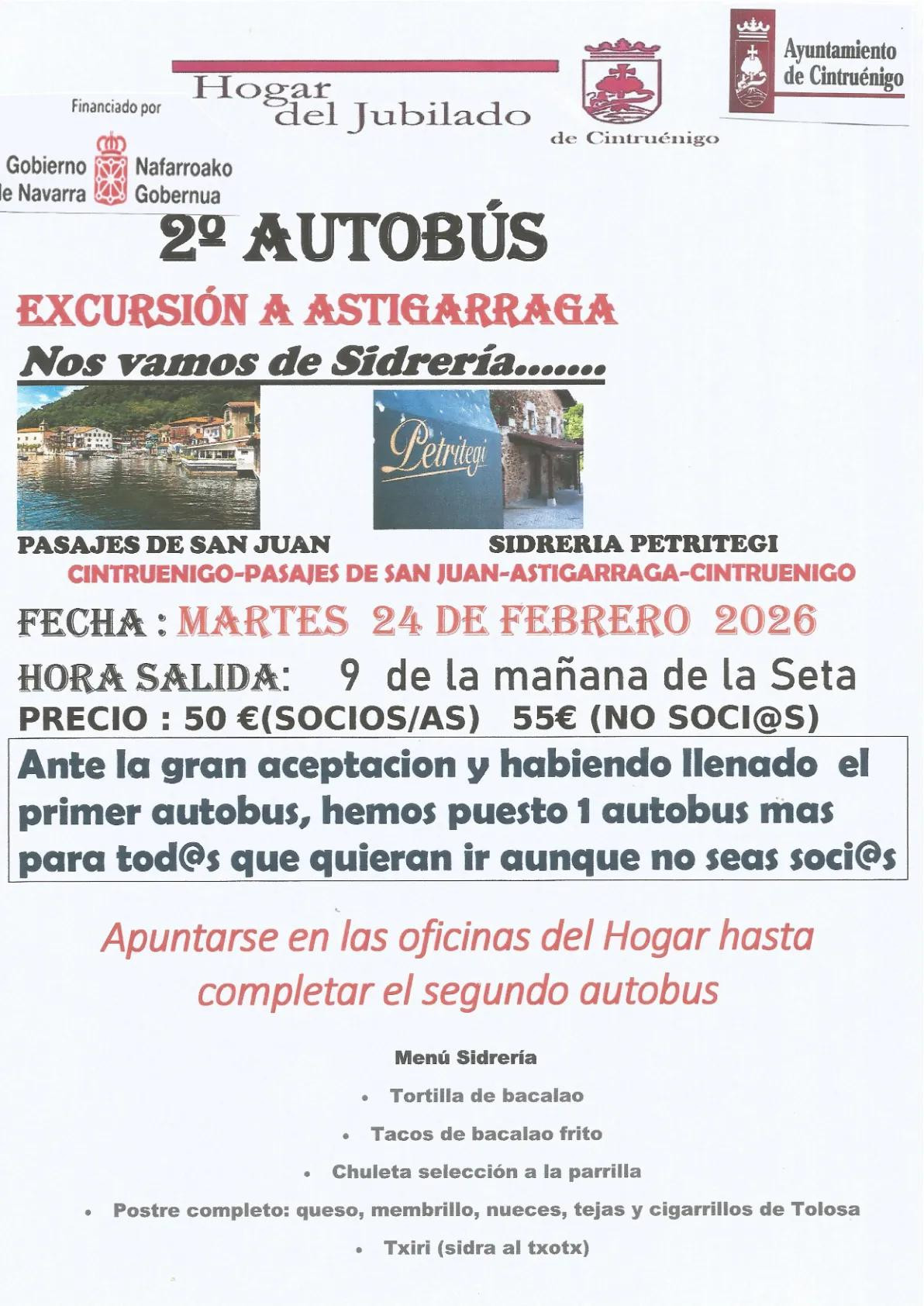 Fecha: martes 24 de febrero. Apuntarse en las oficinas del Hogar hasta completar el segundo autobús. Más información en cartel adjunto.