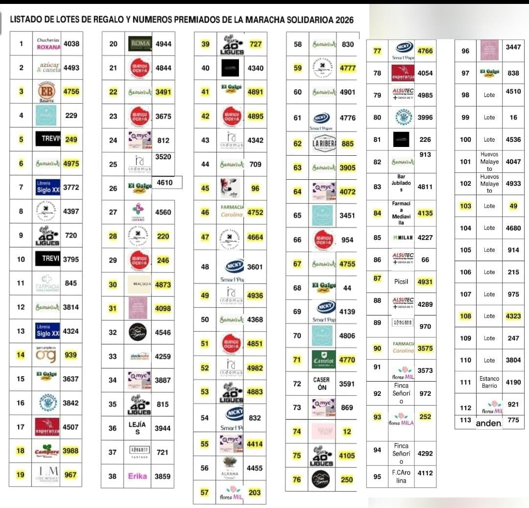 En la Marcha Solidaria. Os compartimos la lista de *números premiados* (en amarillo los que ya se han llevado), y que estarán a vuestra disposición a partir del martes 24 de febrero, en la *Lencería Espe*. ¡ENHORABUENA A LOS PREMIADOS!
