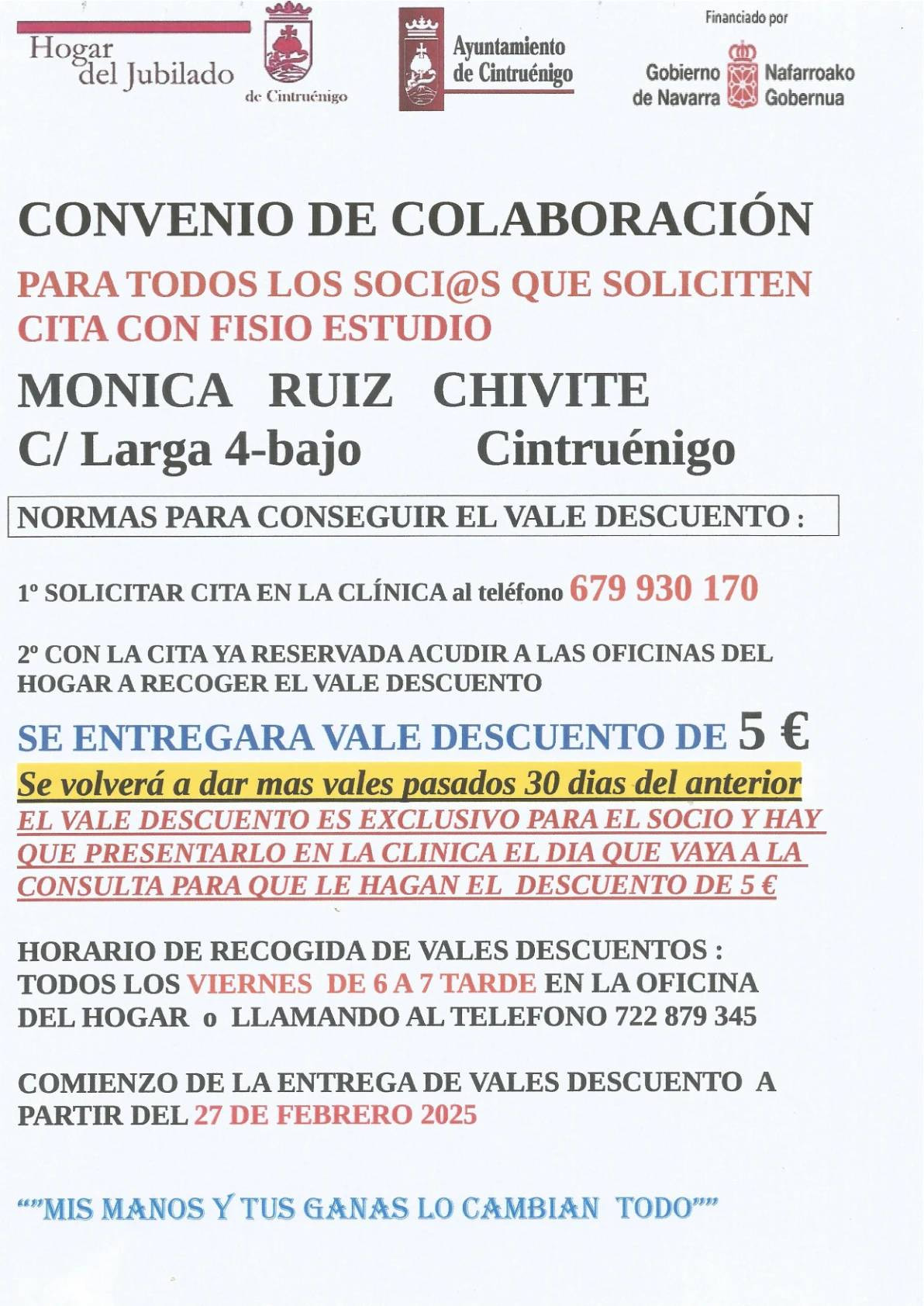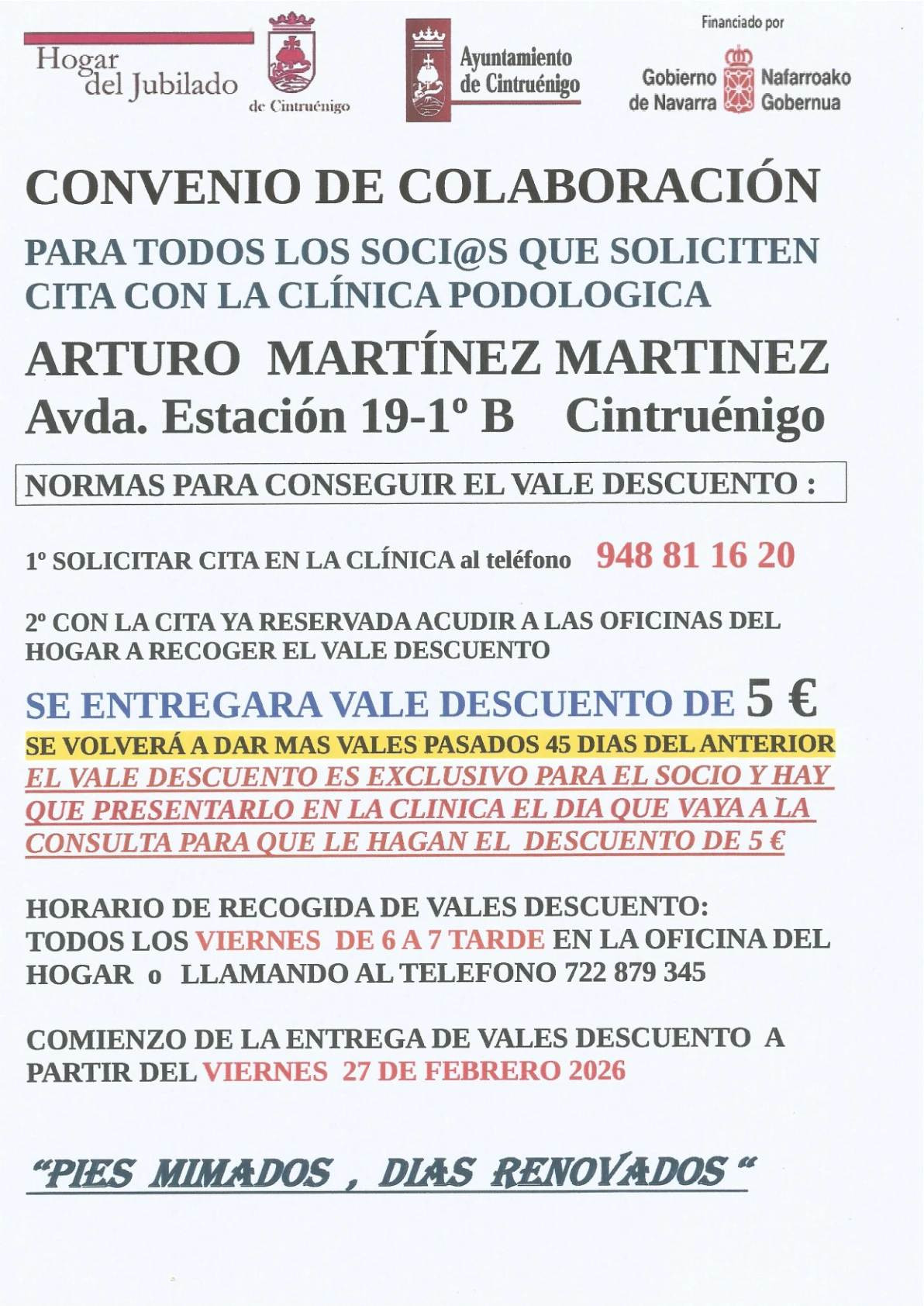 Convenio de Colaboración para Socios: - Descuento en Fisioterapia - Descuento en Podología Más información en carteles adjuntos.