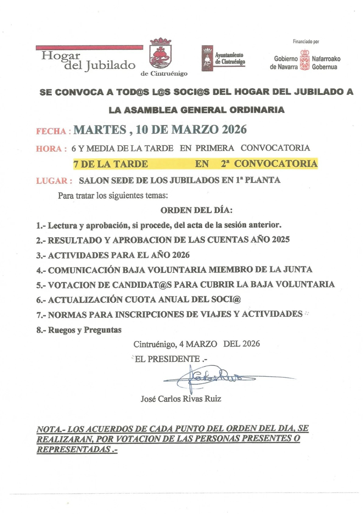 Por problemas técnicos se aplaza la asamblea prevista para el día 10 de marzo. Próximamente se notificará la nueva fecha. Más información en cartel adjunto.