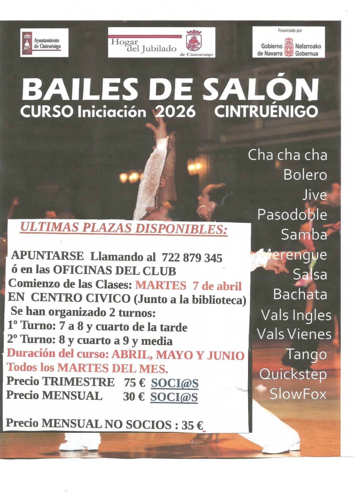 Curso de iniciación a bailes de salón con plazas disponibles.