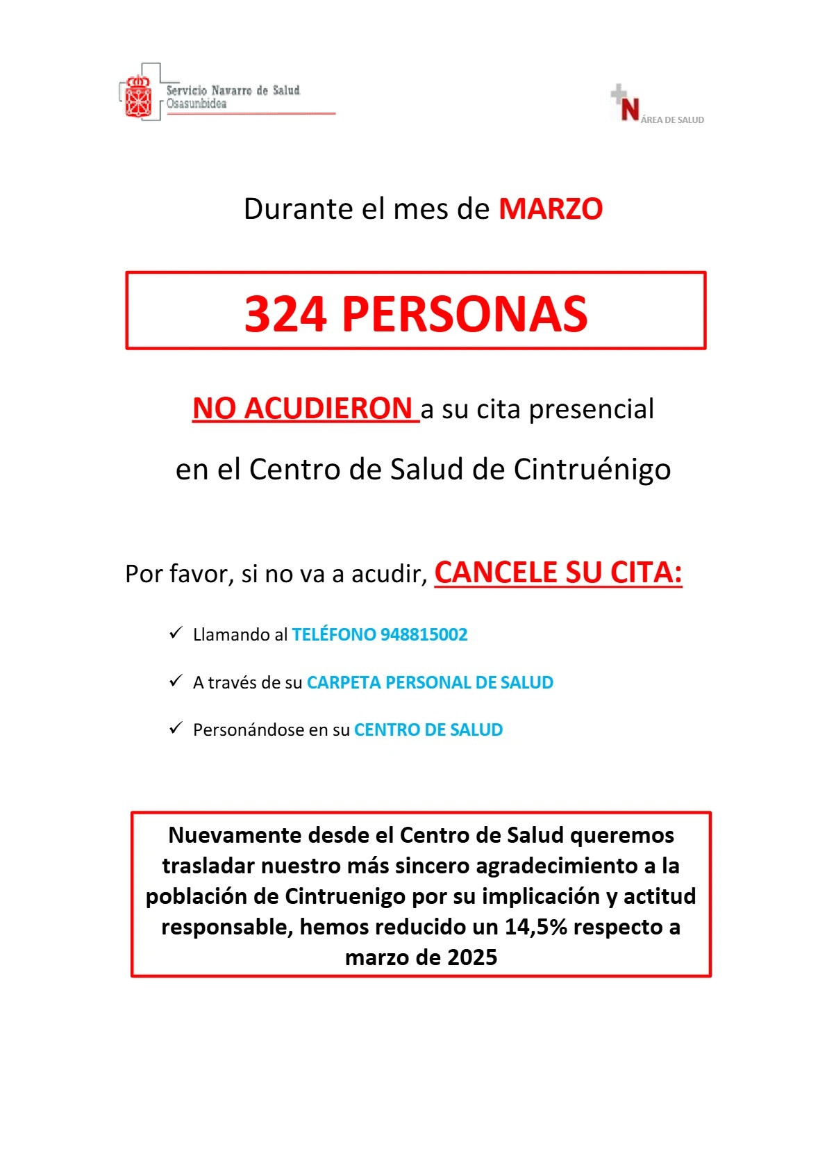 Se agradece la implicación ciudadana y se destaca una reducción del 14,5% en no asistencias respecto a marzo de 2025.